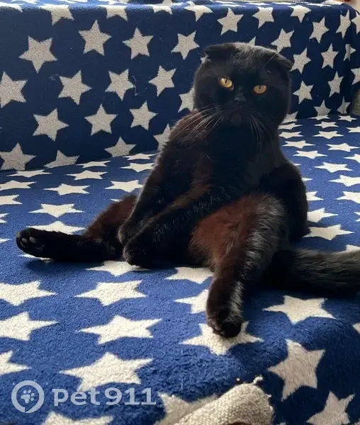 Вислоухий шотландец, черный окрас, на свету шоколад! Кот домашний особо не гуляет, только под присмотром!! В руки не дается очень пугливый! Вышел во двор вечером и больше не пришел.