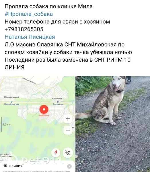 В ночь с 7-8 сентября с участка сбежала собака. Порода хаски. Кличка Мила. На собаке был кожаный коричневый ошейник и адресник. (По последним данным адресник на собаке не видели). Последний раз была замечена в СНТ Ритм. Собака контактная, пойдёт в руки.*у собаки течка. За любую информацию о её местонахождение будем очень благодарны. Телефон для связи +79818265305 Артём