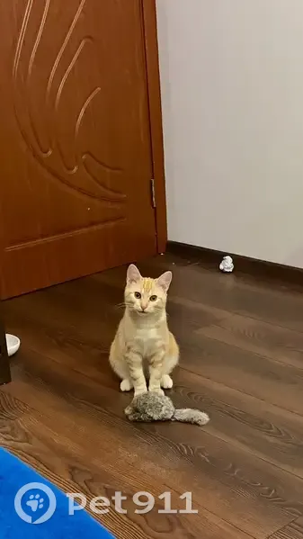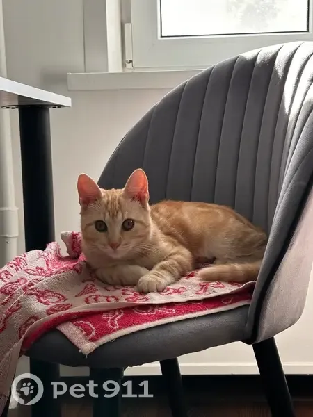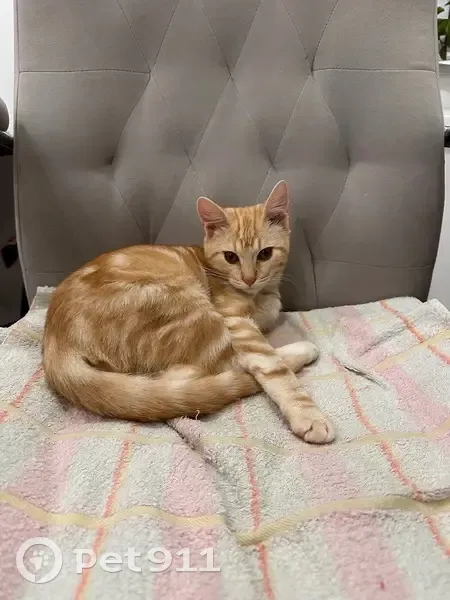 Котик мальчик около 6 месяцев, рыжий с белым рисунком, по бокам на животике как будто кружки нарисованные. Вытянутая немного мордочка. Очень нежный ласковый но пугливый