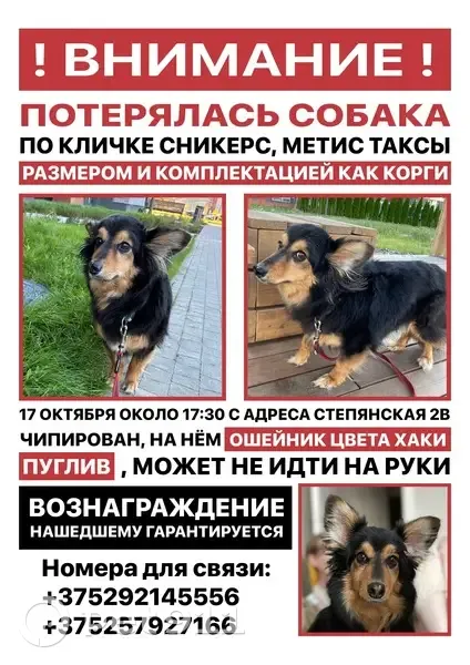 потерялась собака по кличке Сникерс, 17 октября около 17:30 с адреса Степянская 2в, чипирован, на нем ошейник цвета хаки, пуглив может не идти на руки, звонить при обнаружение по номерам, метис таксы, размером и комплекций как корги Номера для связи: +375292145556 +375257927166 Нашедшему обещаем вознаграждение