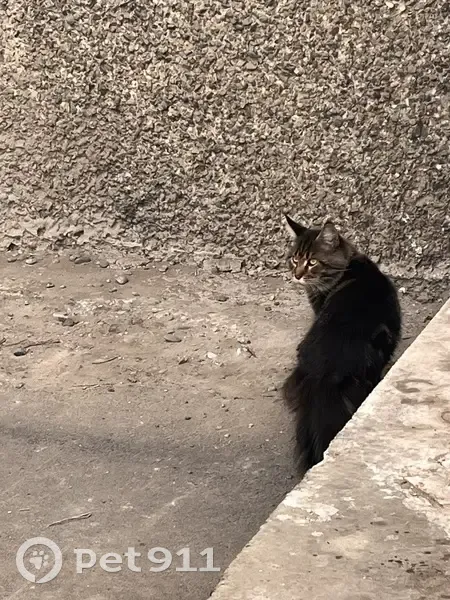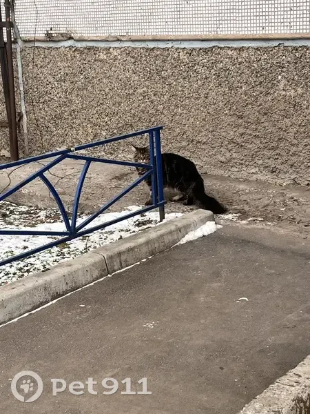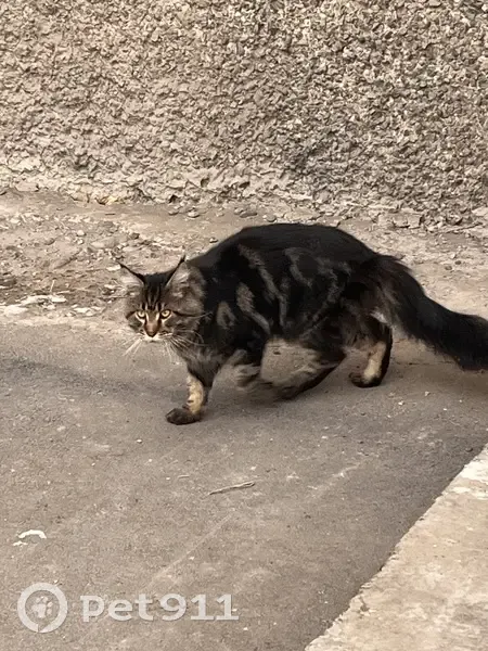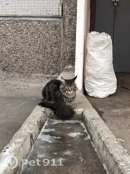 Сегодня подъезжая к дому у подъезда был обнаружен котик, предположительно породы мэйн кун, очень крупный, окрас темный с полосками