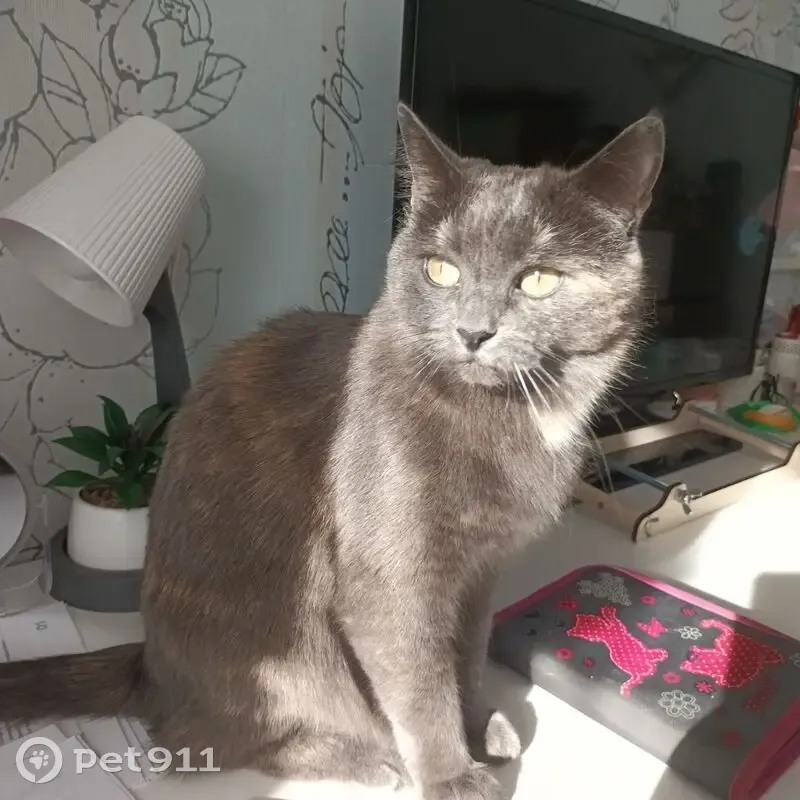 Кошечка серого цвета с пятнышками, небольшого размера. Ошейника и других аксессуаров на ней нет