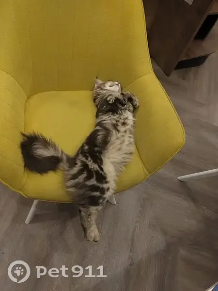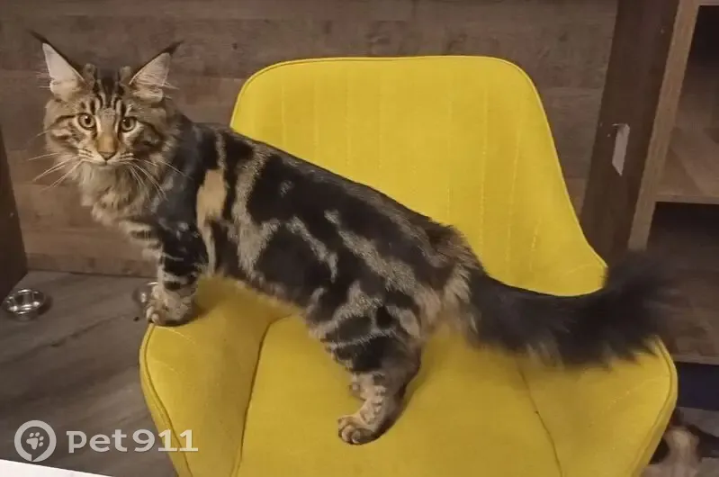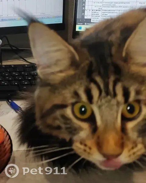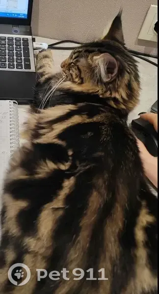 Окрас кошки коричневый с тёмными полосами вдоль тела и тёмными пятнами по-бокам, пузико светло коричневое, лапки коричневые, хвост длинный и тёмный с небольшими светлыми полосками, нос розовый, глаза жёлтые. Выбежала вечером из дома и не пришла больше. Очень похожую кошку 2 недели назад видели в п. Южный ветер, но сообщили только вчера. Мы ездили туда, искали кошку, но ни одной кошки там не встретили. Будем продолжать искать её в той местности