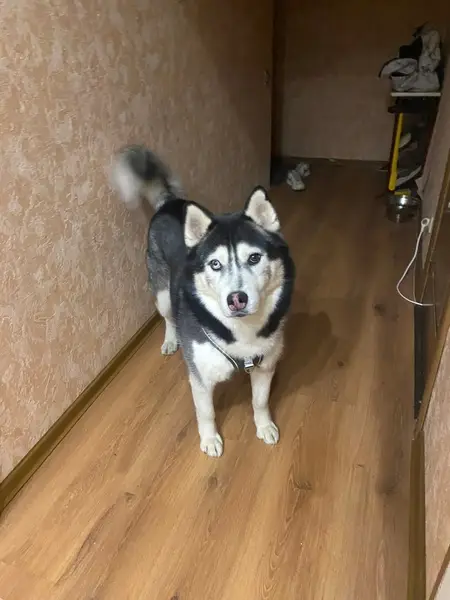 Найдена собака. Фенотип хаски. Сука. Глаза голубые.