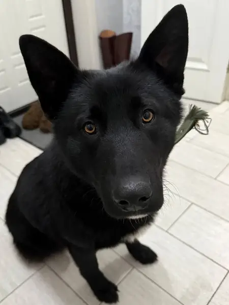 Метис немецкая овчарка. Черный с маленьким белым пятнышком на нижней губе. 7 лет. Ночью сделал подкоп и ушел. Без ошейника.