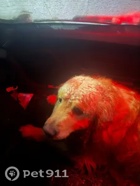 Золотистый ретривер с коричневым ошейником но без адресника. Очень умный, хорошо знает команды и машину, сам запрыгнул в багажник.