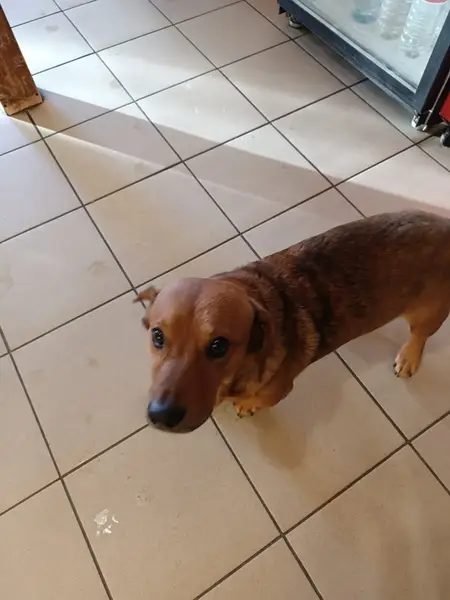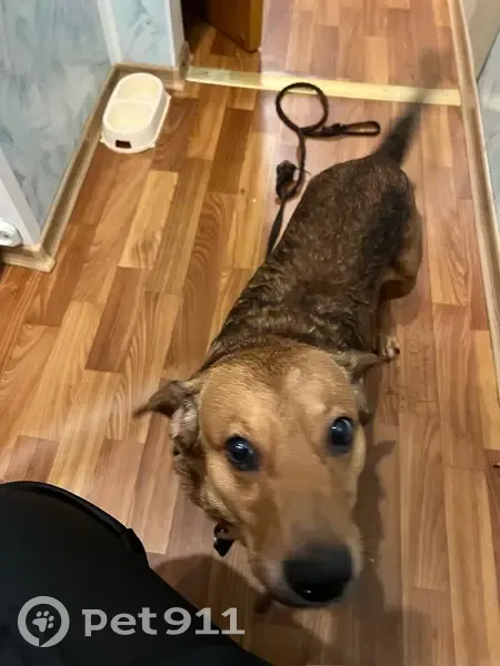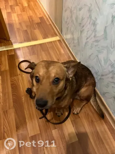 Увязалась за моей собачкой, обратила внимание на то что собака с ошейником и поводком, дрожала и была ласкова, стало её жалко, пришлось забрать на время себе