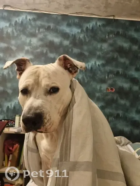 Окрас белый, есть полузаметные черные пятнышки на спине, был в красном светящемся ошейнике и обычном черном ошейнике с поводком рулеткой, последний раз видели его около храма идущего в сторону ДУ.