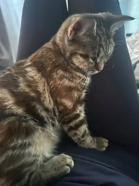 Отзывается на кличку Крис, мейкун, окрас серый в полоску, глаза светло-зеленые, кот крупный, семь лет