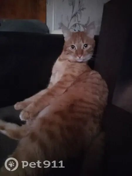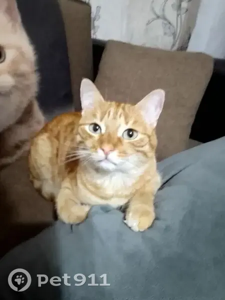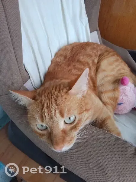 Рыжий кот, на лбу символ в виде буквы "М", голубые/зелёные глаза, вроде бы под правым глазом есть родинка в виде точки. Выпрыгнул со 2 этажа через балкон дома. Живу я в пяти-этажке.