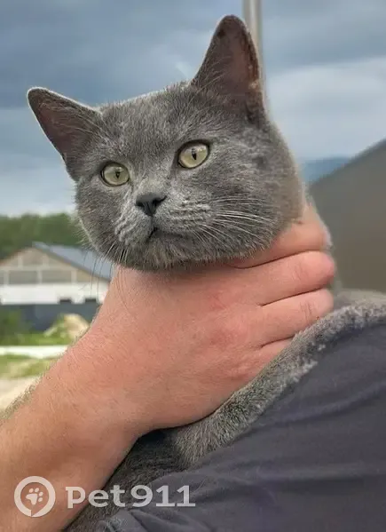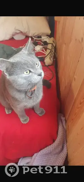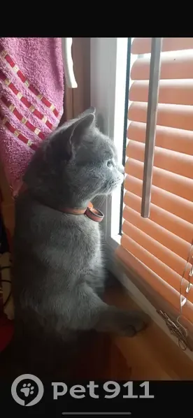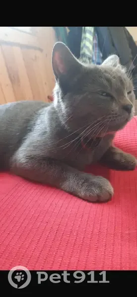Британский, возможно смесь Очень добрый Некастрированный, визуально 1,5-2 года возраст Оранжевый ошейник от блох Очень общительный парень
