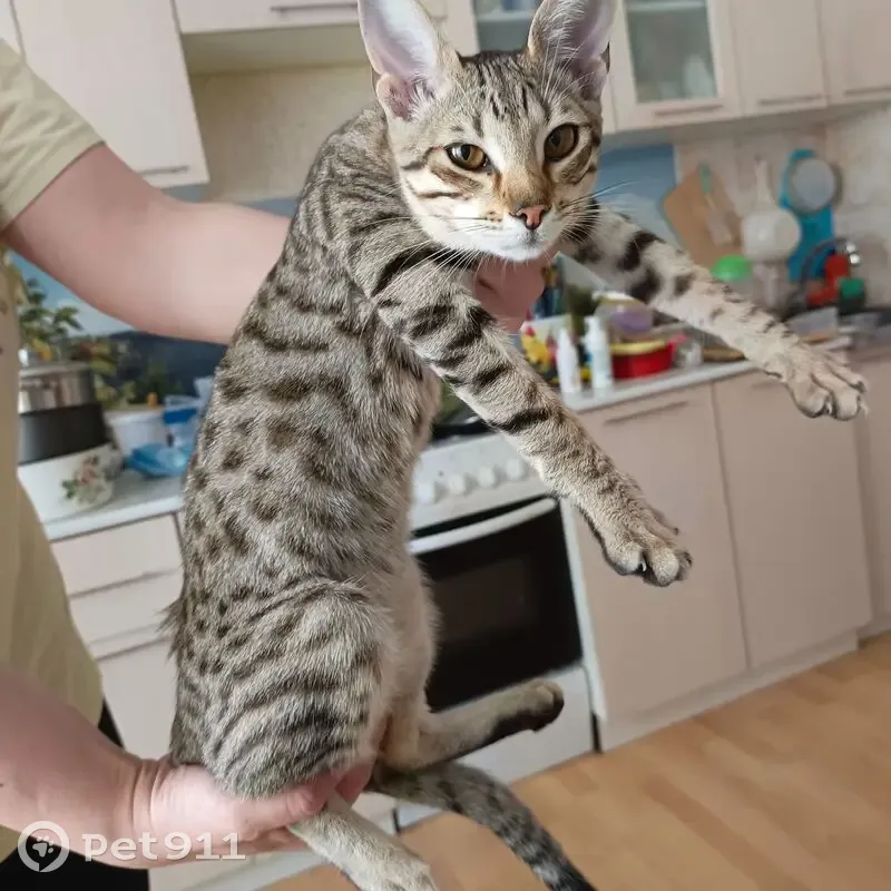 Полосатая, пятнистая, коричневый, бежевый, чёрный. Большие уши, длинные лапы и хвост, очень стройная кошка. Ходила по велосипедной дорожке в парке и кричала диким голосом. Была голодна. Очень ласковая, любит сидеть на руках, мёрзнет, видимо. Шерсть шелковистая, похоже без подшёрстка.