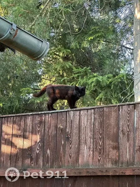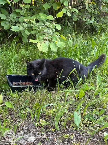 Черная кошка, пушистая, желтые глаза. Выглядит очень ухоженной. Ошейника нет.