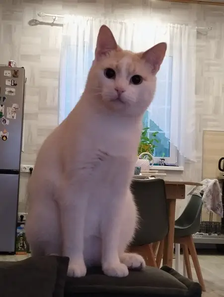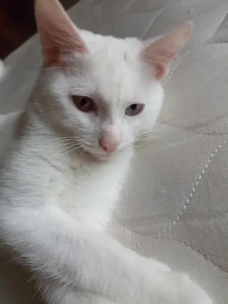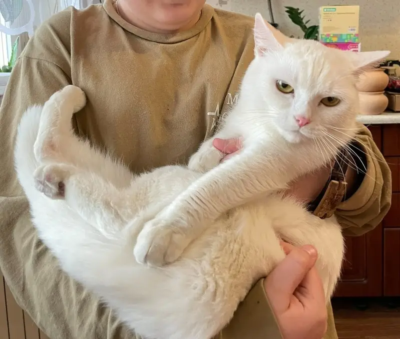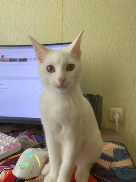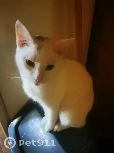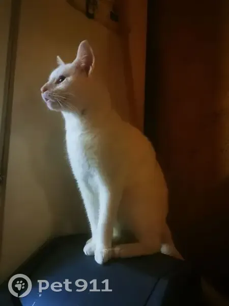 Белый кот с серыми отметинами на голове и хвостеи розовым носом . Был надет кожаный коричневый ошейник.