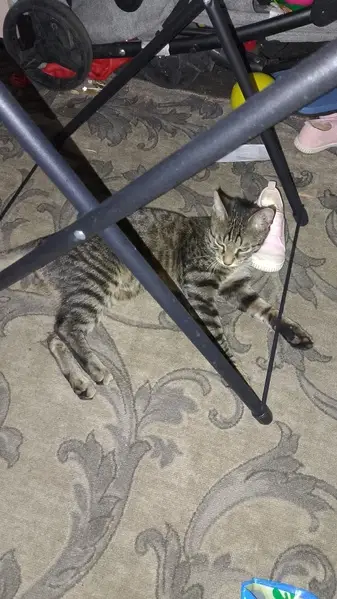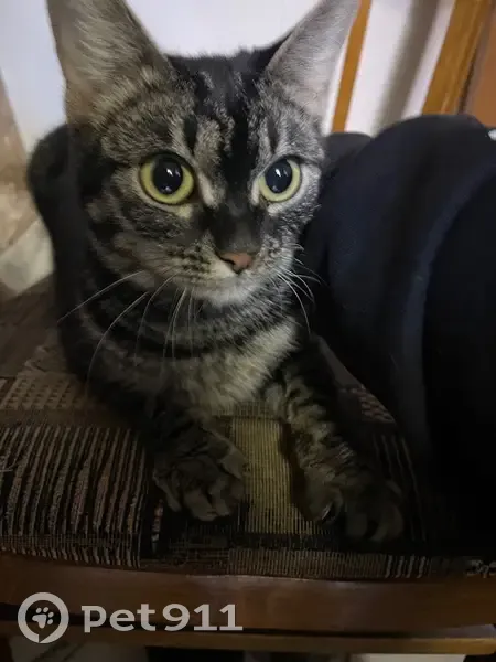 В районе 10-й школы сидела на дереве и кричала. Полосатая, окрас темный, на вид месяца 4 кошечке. Очень общительная и ухоженная. Видно домашняя. Забежала сразу в помещение.