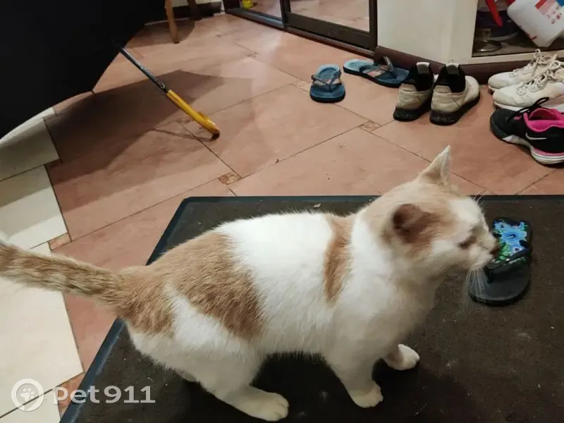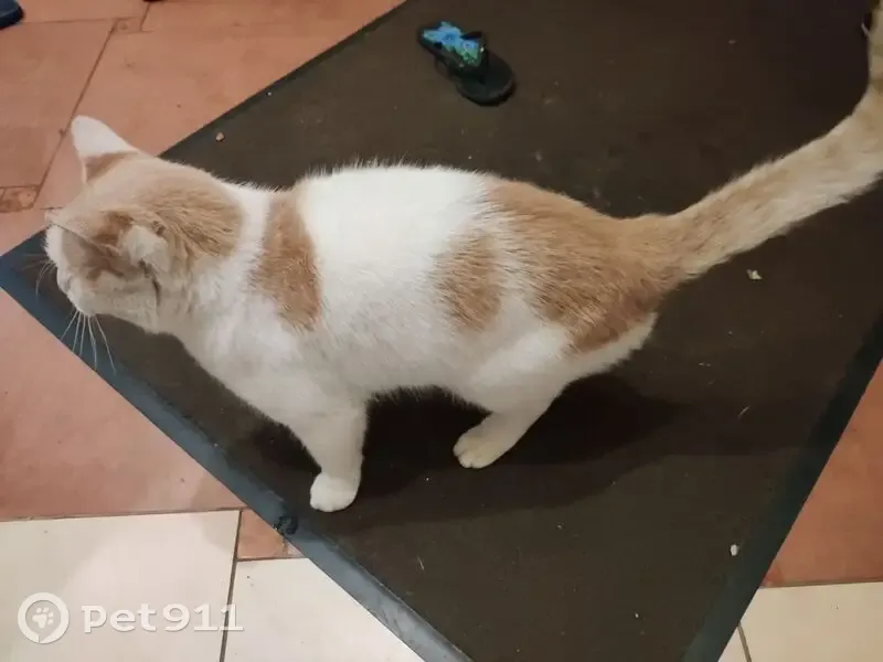Кот не кастрированный, белый со светло рыжими пятнами, взрослый, очень худой, давно на улице, но явно бывший домашний, так как легко идёт на ручки, не боится людей