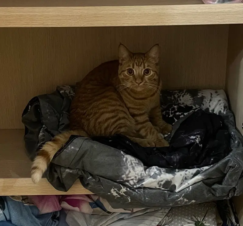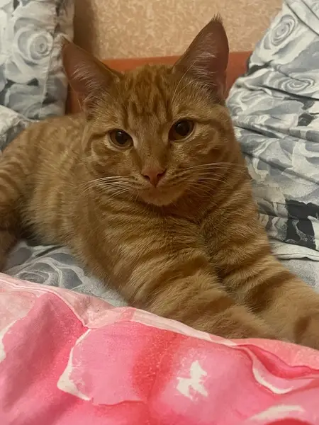 Рыжий кот. Домашний, ухоженный. Без ошейника. С белым галстуком. Очень добрый. Шёл на обход. Мяукал. Побежал за мной.Работаю на птицефабрике в Новопетровске.