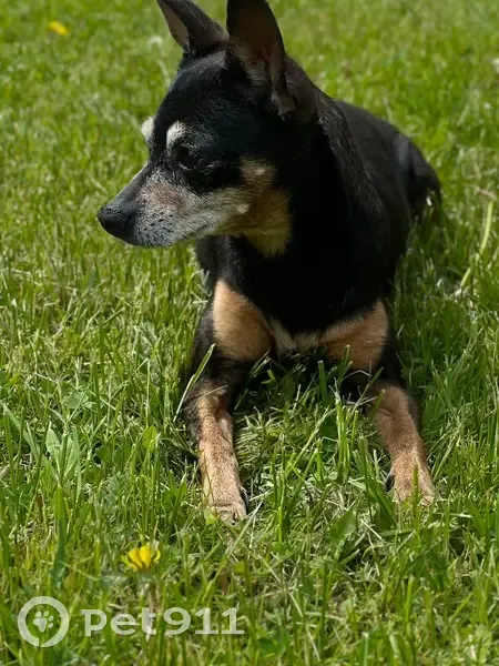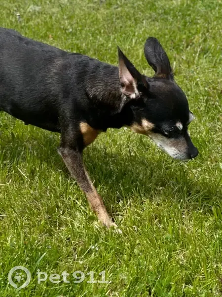 Девочка, похожа на пинчера, длинные когти, сначала крайне осторожная, потом очень ласковая, седая мордочка, но белые зубы. Чипа нет. Забежала на участок.