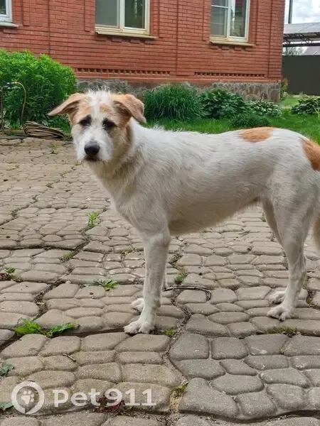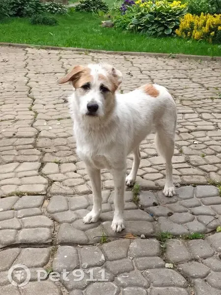 Прибилась собака, крупная , пугливая, белая с коричневыми пятнами, сука.