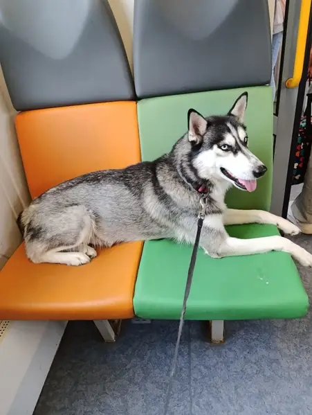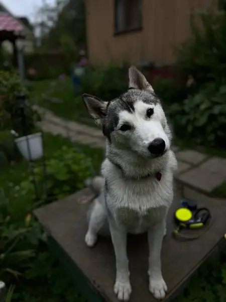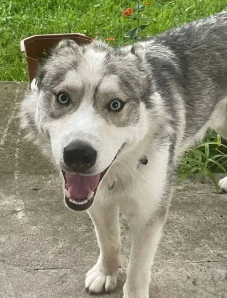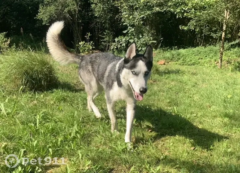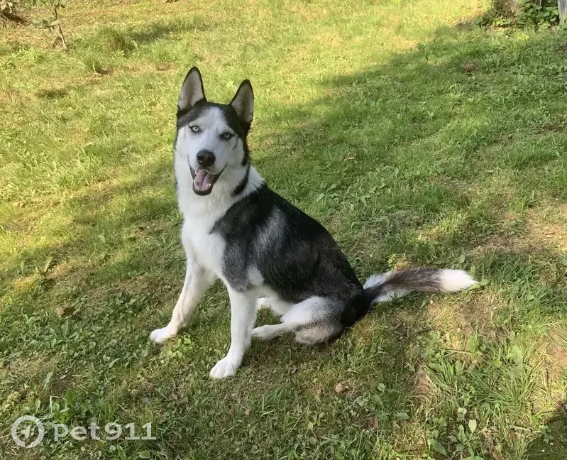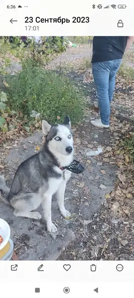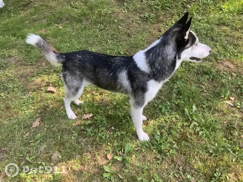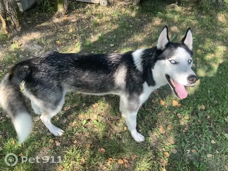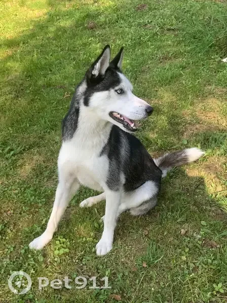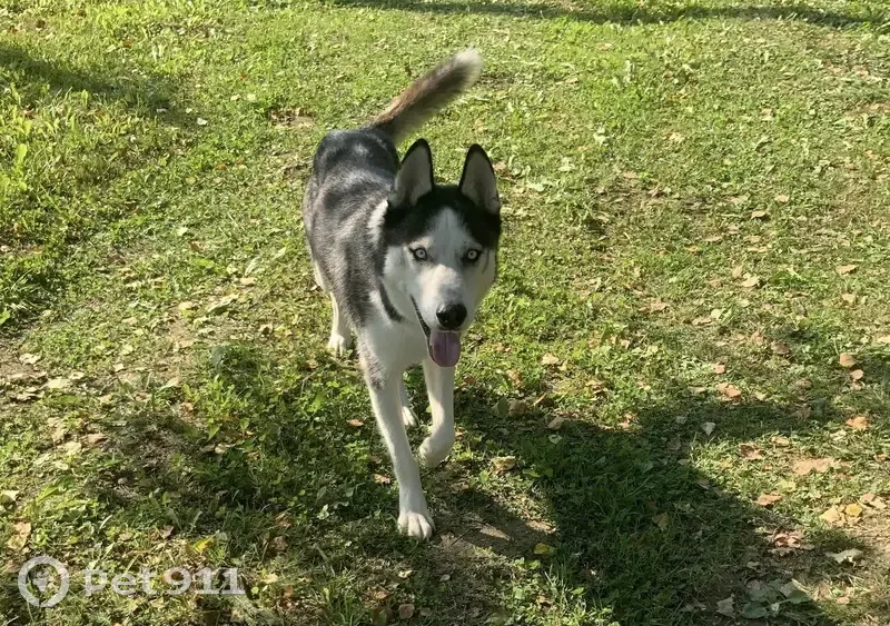Молодой пёс породы хаски. С чёрно-белым окрасом и голубыми глазами. На хвосте немного бурой шерсти. Кастрирован. Характер активный и дружелюбный. Был найден без ошейника и сейчас находится под присмотром.