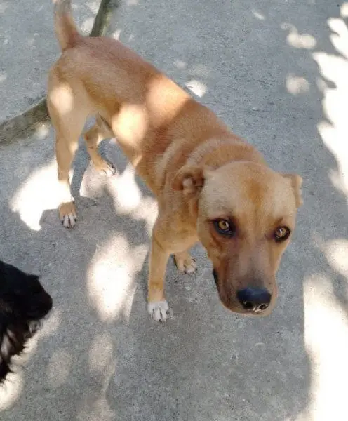 Окрас бежево-рыжий. С ошейником. Спокойный.