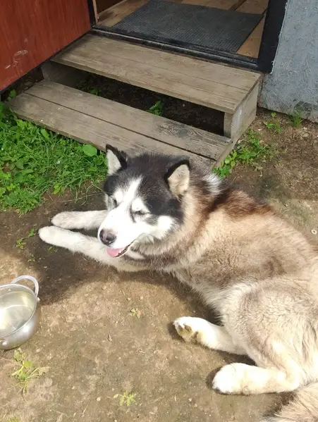 Это щенок, похож на хаски или аляскинского маламута, мальчик, добрый, ласковый, энергичный. Потерялся не 9 августа, а раньше, так как вчера он ночевал в Синьково на чьем-то участке, а сегодня опять бегал по улице, пока взяла его к себе.
