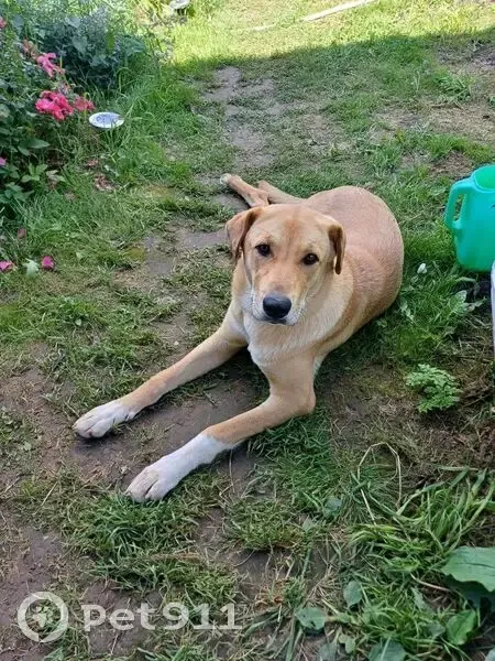 Это средняя по размеру собака с короткой светло-коричневой шерстью. Уши у неё слегка опущены, а взгляд мягкий и внимательный. На шее есть ошейник.