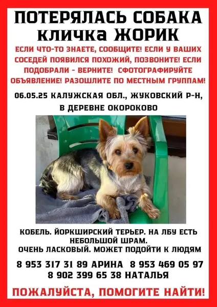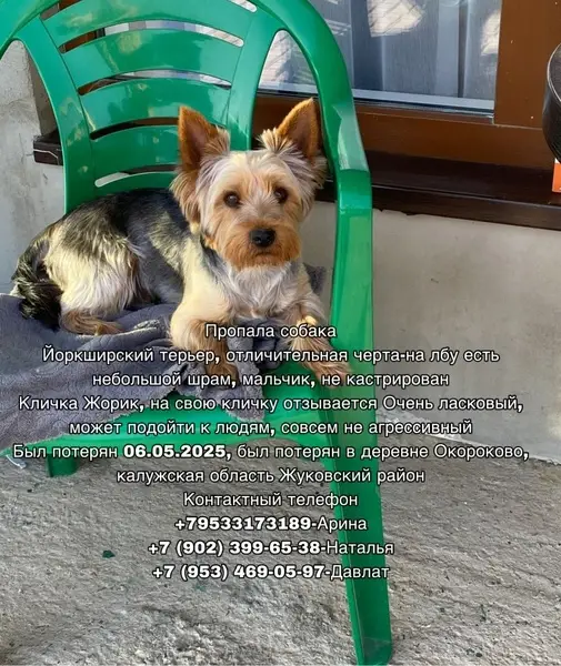 24.08.2025г. В Наро-Фоминском районе, спк Ветеран-дубки был найден молодой кобель породы йоркширский терьер.Окрас темно-стальной с ярко золотым подпалом. Добрый, немного пугливый. Увезался за собакой родителей. По словам соседей мотается уже не первый день по снт. Ищем только владельца.