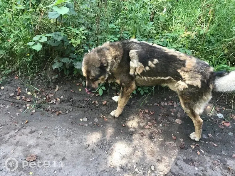 По д. Качаброво и п. Заречный бродит пес, есть ошейник. Собака запущена, больной глаз, сильно линяет. Ходит по всему посёлку, подходит к воротам, людей не боится.