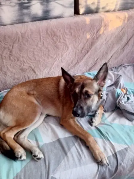 Рыжая с подпалом, морда черная. Есть ошейники с адресником. Указаны кличка и номер телефона. Телефон не отвечает