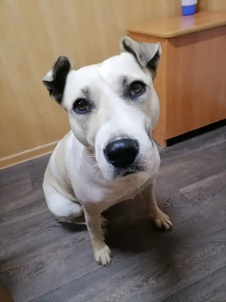Похож на стаффоширдского терьера, кастрированный молодой кобель. Палевый с белыми пятнами, когти пострижены, вполне упитанный, очень ласковый, без ошейника. Бегал по лесной дороге, сам запрыгнул в машину, как только остановились и открыли дверь.