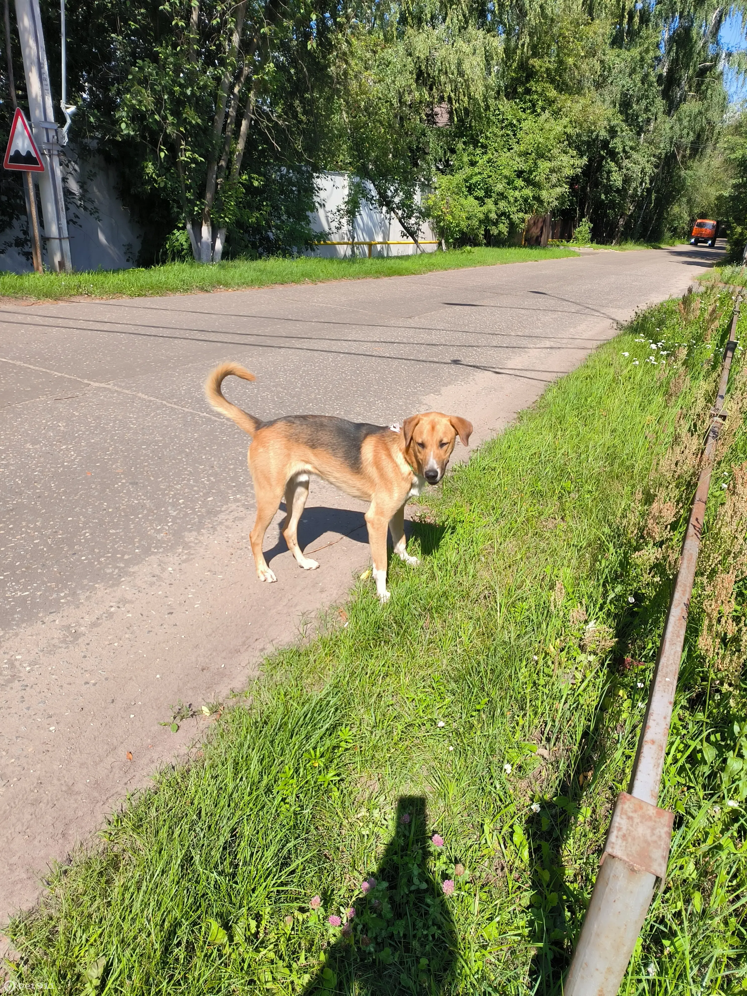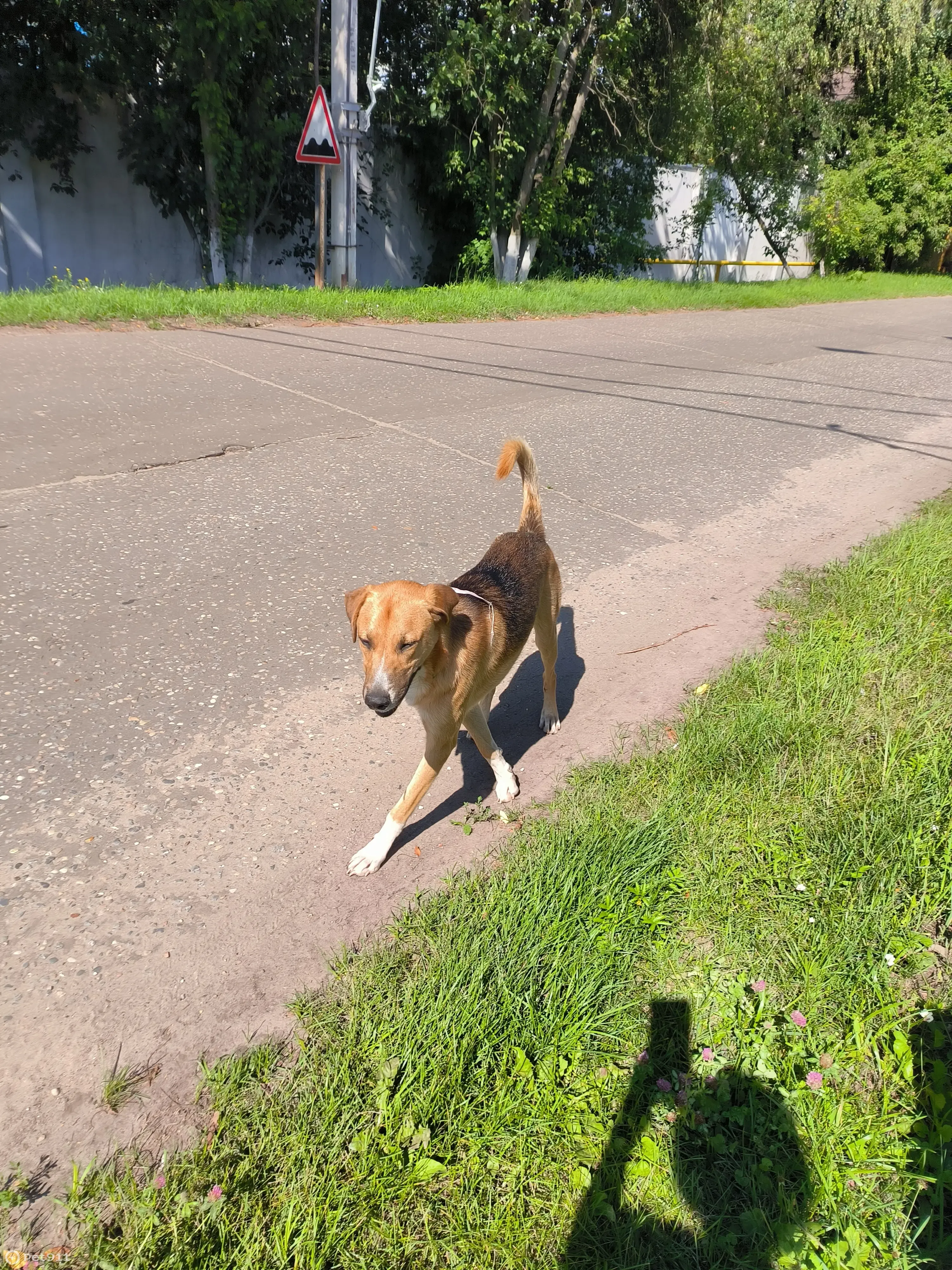 Кобель молодой, похож на охотничью, окрас коричневый с чёрными пятнами на спине и на морде у носа. Найден на территории котеджного посёлка Шевелкино-4 по Горьковскому шоссе. На шее был ошейник зелёного цвета от клещей и цепь металлическая с кольцом, на кольце обрывки проволоки.