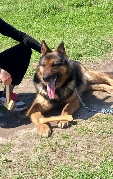 Кобель, не кастрированный, в холке 45 см, возраст 1год, метис овчарки, очень контактный, сам подошёл, ходит на поводке, коричневый ошейник.