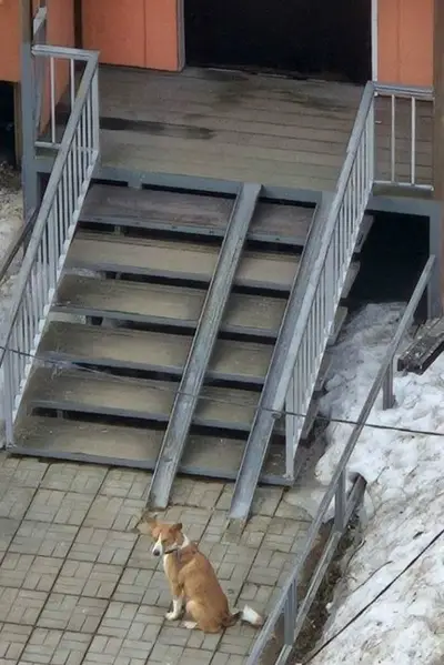 Бегает истощенная собака, кобель , молодой, окрас рыже белый