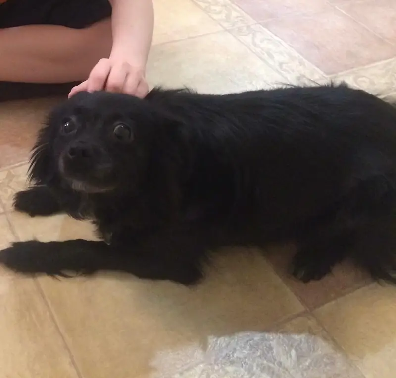 Окрас черный с белыми пятнами на груди и брюхе. Дружелюбна, без ошейника, но знает, что такое влажный корм в пакетиках. Ест сухой корм. Живет уже больше месяца под машинами.