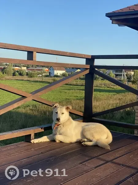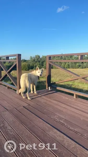 Нашелся молодой пес, мальчик, кастрированный, ласковый, с оранжевым ошейником, белый с немного серым на макушке окрасом