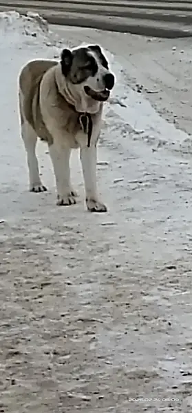 Похож на Алабая, очень боится, не подходит. Худая слишком, давно видно бегает. Живёт в канаве в лесу, случайно наткнулись.