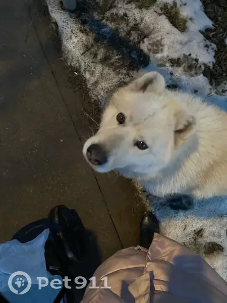 Собака с ошейником, знает команду «сидеть», ласкова к людям. Белый кобель. Замечен в г. Покров, с. Покров, бегает, скитается по деревне. Возможно, собаку вывезли специально, потому что пёс предано сидит у мусорки и ждёт «хозяина». Себе забрать не можем - уже есть кот и кошка.