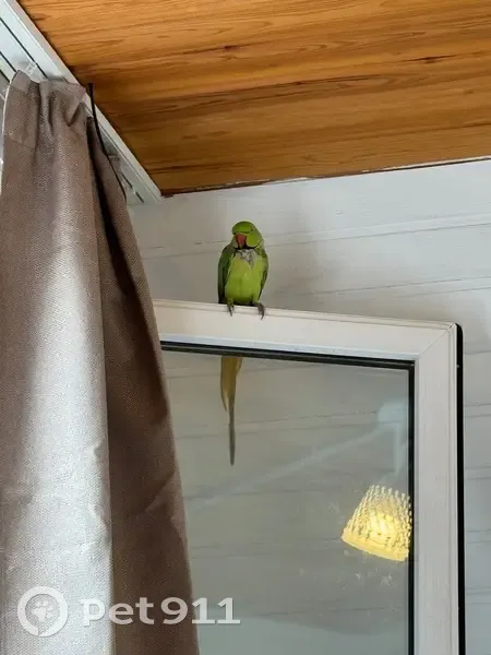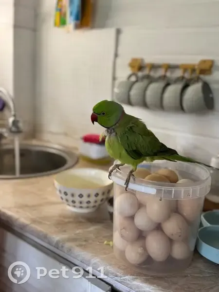 Ожереловый попугай, самец. Зеленого цвета с ожерельем на шее. Отсутствует перья на груди и под крыльями. Пропал утром 20.07