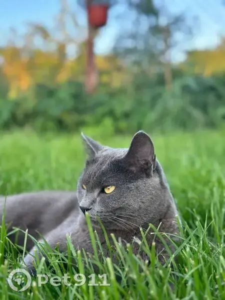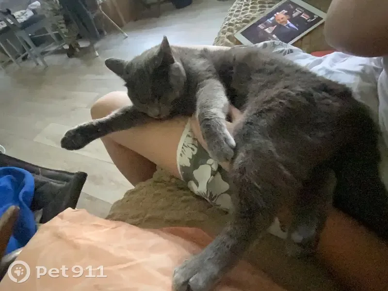 Серый кот, на груши ближе к шеи маленькое-меланькое белое пятнышко. Отзывается на имя Гоша (гоша кушать) Деревня Лавреньтьево (ступинский городской округ) и близ лежащие деревни и поселки