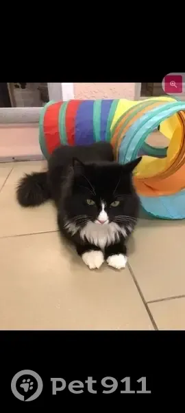 Потерялся кот по имени Томас. У кота неуверенная походка, задние ноги западают. Лазить по деревьям не может, но может прыгать как белка по земле. Окрас черный с белой грудкой, лапками и носом. Хвост пушистый, при походке держит его трубой.