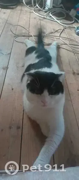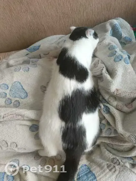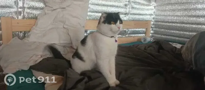 Барсик, вислоухий белый с чёрными пятнами на спине и с чёрным хвостом, на мордочке в виде маски, на шее сиреневый ошейник с бубенчиком коту 1 год. Тел: +7 903 193-33-38 Оля