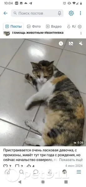 Трехцветая кошечка, левая лапка полностью белая, правая разноцветная, пропала год назад, убежала у новых хозяев на 2 день, может находится где угодно, мне хотя бы знать что она жива и может её кто то приютил, не теряю надежду что кто то отзовётся