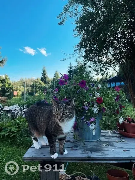 Девочка, стерилизована. Окрас шпротный, серо-черный. Ушки черные, белая грудка, пальчики на передних лапках беленькие, пузико белое. Нос кирпичный. Она пугливая, к чужим людям может не подойти. Отзывается на кличку Кусь, Кусьяна. Убежала из дома и не вернулась.