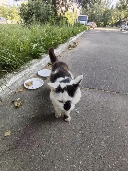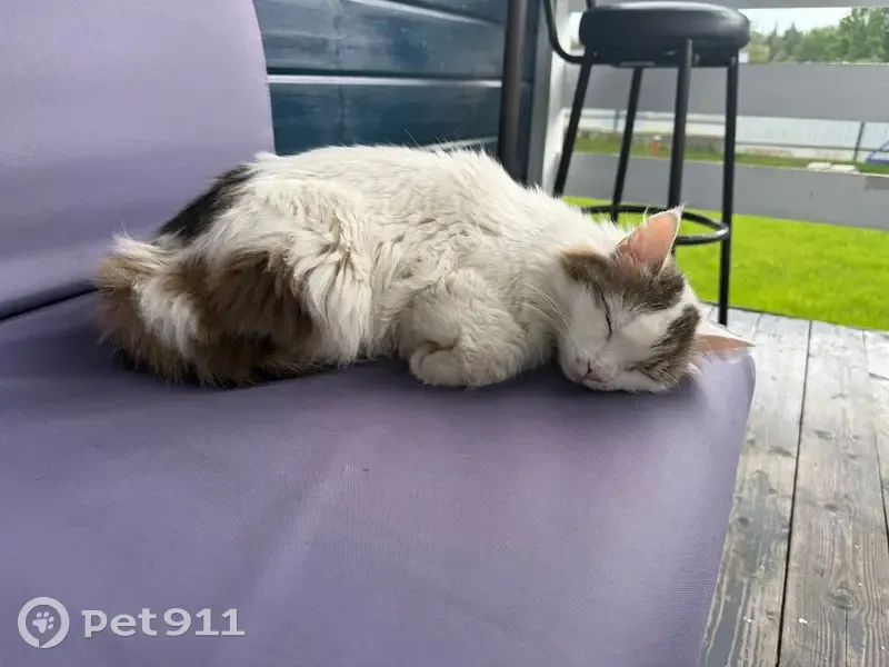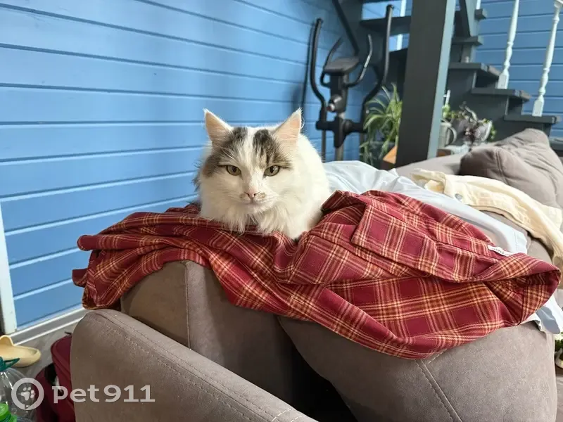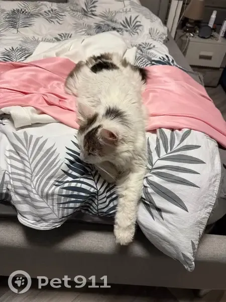 Окрас белый, сибирский пушистый кот. С пятнами на морде, и на теле, ближе к хвосту пятно как сердечко. Боится людей очень острожный кот. Откликается на кличку Сыр, Сырок, Сырка. На шее черный ошейник