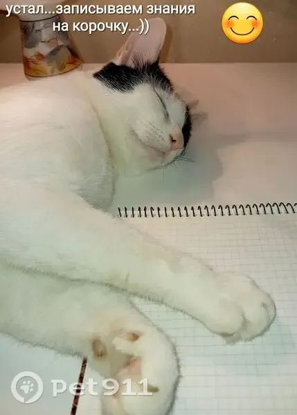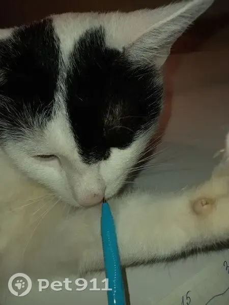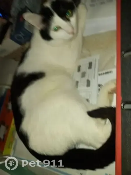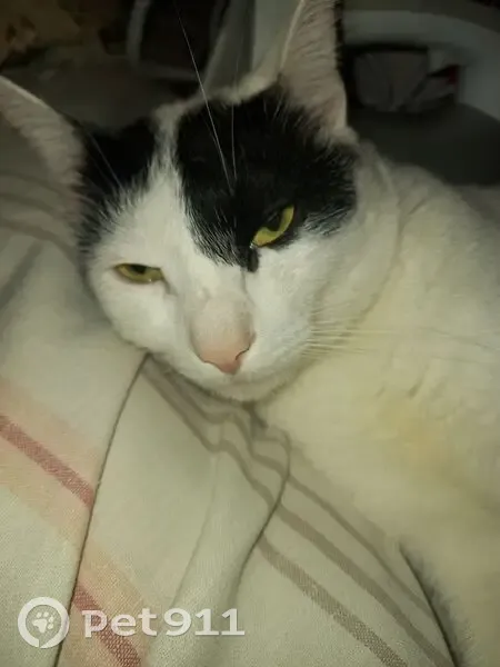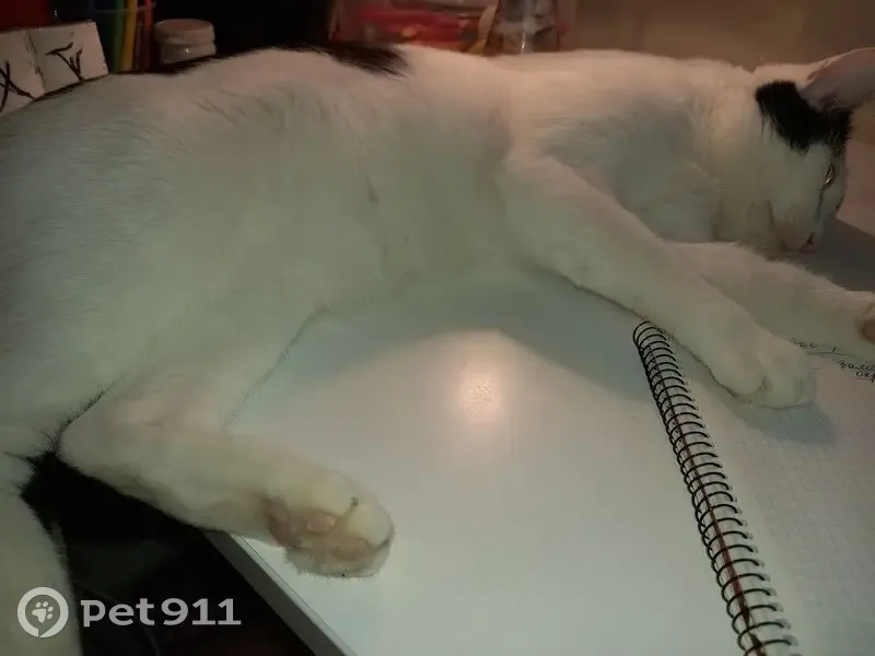 Белый, над правым глазом немного чёрной шерсти, на левом глазу чёрная шерсть, как у пирата. От середины белой спины к попе идёт чёрный рисунок в виде морского конька. Хвост чёрный. В субботу я уезжала, садилась в такси, кот был на улице через дом, видел, как я сажусь. Утром он не вернулся домой. Больше его не видели. По ночам он гулял и к 4 утра возвращался или к 7-30, самое позднее. Первым делом бежал на кухню и ждал, когда согрею корм и покормлю.Затем шёл спать.Даже на участке приходил ко мне. Вчера(21.08) приехала его искать, спросила в магазине, спрашивали с сыном у детей, прохожих, ходили по краю леса и звали. Кот исчез, никто не видел...