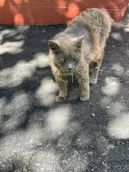 Серый кот, возрастной, немного худоват из-за болезней кишечника и почек. Шерсть до холки более серая и гладкая, после буреет и её больше (нормально не отлинял, прямо виден переход этот). Громко мяукает. Пропал в Щелково (Жегалово).