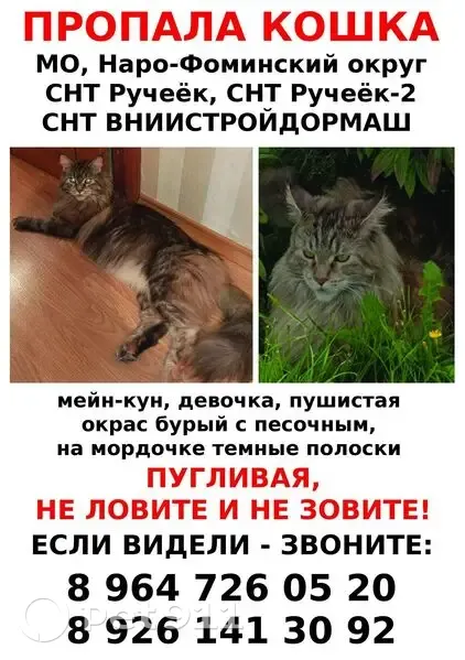 Кошка в течке на сильном стрессе сбежала из питомника в частном секторе, куда была привезена на вязку. У нее песчано-бурый камуфляжный окрас, "черепашковый", и полосатая мордочка. Откликается на "Моргош" и возможно еду. Может находиться в СНТ Ручеек, Ручеек-2, СНТ ВНИИСТРОЙДОРМАШ