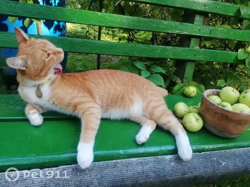 Кот ярко-рыжего окраса с белым галстучком и лапками и буквой "м" на лбу. Возраст 2 года, кастрирован, чипирован. Ушёл из дачного дома утром 08.09.2025 и с тех пор не возвращался. Спокойный, но пугливый и осторожный. Может гулять в радиусе примерно от быковского храма до 4 Октябрьского переулка, возможно дальше. Носит жёлтый ошейник с медальоном-адресником