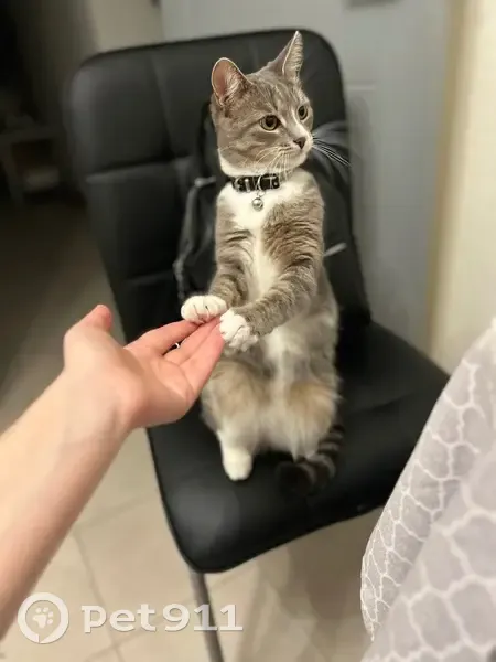 Серая кошечка , с ошейником , на ошейники номер телефона и имя «милка»